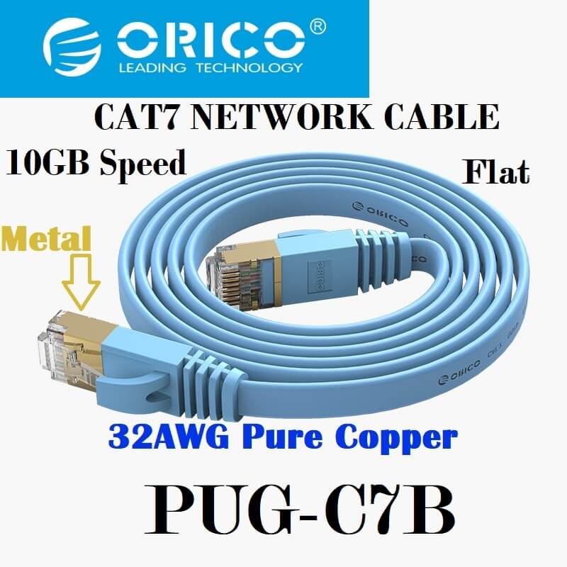 Orico CAT7 Network 5Meter Flat Cable 10GB Speed, 32AWG Pure Copper Wire, Metal Modular, PVC Coating, 8Core Structure, Oxygen Free, 24K Gold Plated PIN, Waterproof, Sun block, Freeze Resistant, Soft and Smooth Ethernet, Light Blue, PUG-C7B-50-BL