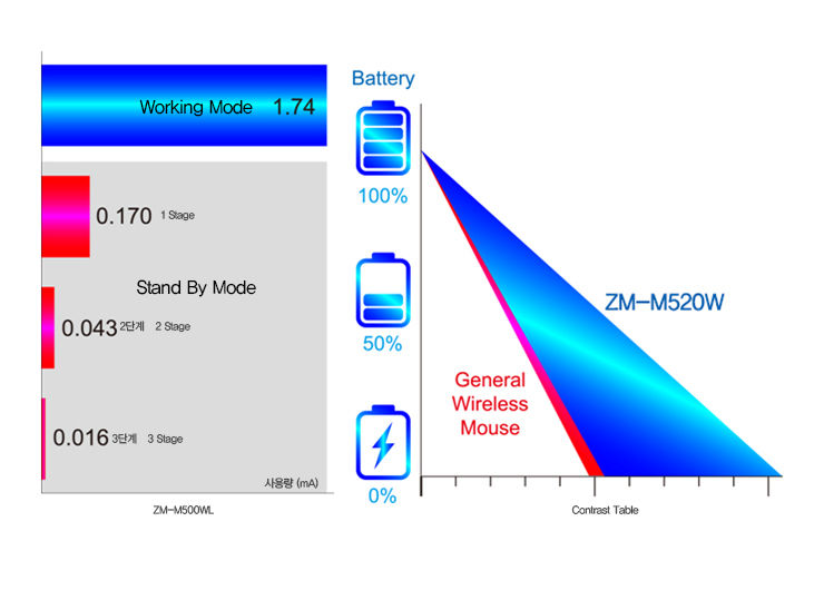 يدير Zalman ZM-M520W استهلاك الطاقة بحكمة ، ويتحمل شحنة واحدة أطول بمرتين من الماوس اللاسلكي العادي. تم تحقيق ذلك من خلال تنفيذ وضع الاستعداد الموفر للبطارية من ثلاث مراحل مع عدم الحركة لفترة طويلة.