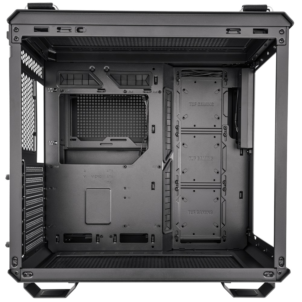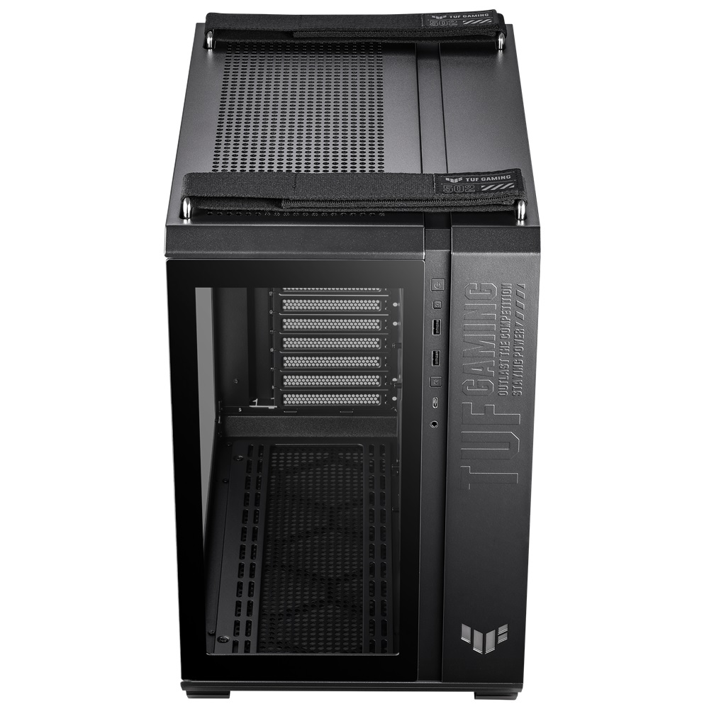 تواصل اللوحة TUF Gaming GT502 تحسينات البناء الخاصة بها من خلال اللوحات الجانبية التي يمكن إزالتها ببساطة عن طريق الضغط على زر مخفي في الجزء الخلفي من الهيكل.