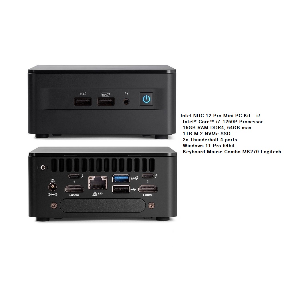 طقم كمبيوتر صغير Intel NUC 12 Pro - معالج Intel® Core™ i7-1260P - ذاكرة وصول عشوائي DDR4 سعة 16 جيجابايت، 64 جيجابايت كحد أقصى - 1 تيرابايت M.2 NVMe SSD - 2x Thunderbolt 4 منافذ - Windows 11 Pro 64bit - مجموعة ماوس لوحة المفاتيح MK270 Logitech