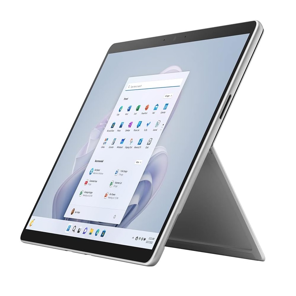 Microsoft Surface Pro 9. قطر الشاشة: 33 سم (13 بوصة)، دقة الشاشة: 2880 × 1920 بكسل. سعة التخزين الداخلية: 256 جيجابايت. عائلة المعالج: Intel® Core™ i5، طراز المعالج: i5-1245U. الذاكرة الداخلية: 8 جيجابايت. دقة الكاميرا الخلفية (رقمية): 10 ميجا بكسل، نوع الكاميرا الخلفية: كاميرا واحدة، كاميرا أمامية. معيار Wi-Fi الأعلى: Wi-Fi 6E (802.11ax). الوزن: 879 جرام. نظام التشغيل المثبت: Windows 11 Pro. لون المنتج: بلاتيني