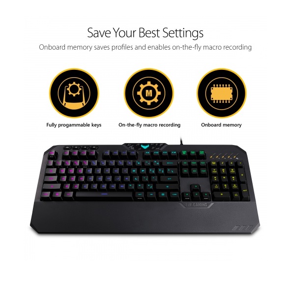 يتميز صندوق TUF Gaming Combo Box بلوحة مفاتيح وماوس TUF للألعاب لوحة مفاتيح الألعاب - مفاتيح الغشاء الميكانيكي (الغشاء الميكانيكي) ماوس الألعاب - دقة الحركة والهدف تتميز إضاءة ASUS Aura Sync RGB بمجموعة لا نهائية من الألوان تقريبًا برنامج ROG Armory II لسهولة التخصيص