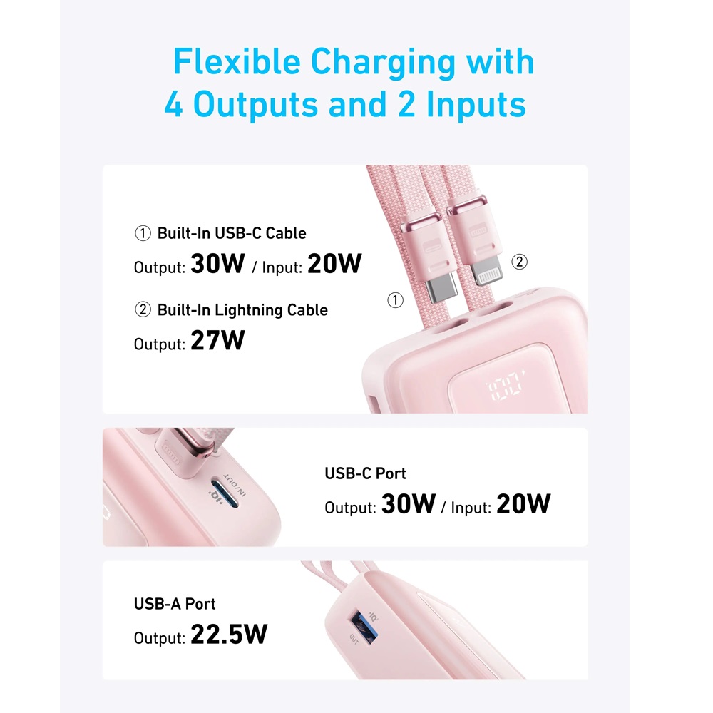 أنكر A1681 Zolo باور بنك بسعة 20000mAh وقدرة 30 واط مع كابلي USB-C ولايتنينج مدمجين