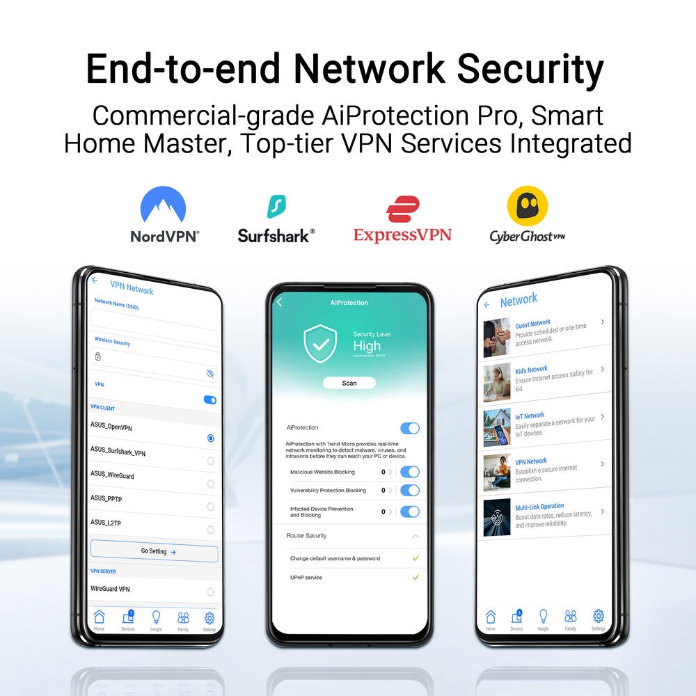 ASUS RT-BE58U واجهة المستخدم عبر الويب: ASUSWRT وضع الراوتر اللاسلكي وضع نقطة الوصول وضع جسر الوسائط 1x منفذ 2.5G لـ WAN/LAN 1x منفذ 1G لـ WAN/LAN 3x منافذ 1G LAN تقنية AiMesh، التحكم الأبوي إدارة حركة المرور MU-MIMO