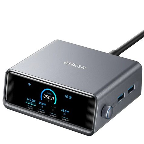 يُوفر شاحن أنكر برايم ذو 6 منافذ وقدرة 250 واط طريقة مرتبة لشحن عدة أجهزة في وقت واحد، بالإضافة إلى خيارات قابلة للتخصيص لضبط سرعة شحن كل جهاز بسهولة، مع شاشة سهلة القراءة تُظهر مقدار الطاقة المرسل إلى كل جهاز. تتطلب جميع الأجهزة الرقمية شاحنًا، إما مدمجًا أو عبر مصدر طاقة خارجي، لكنها غالبًا ما تستخدم شاحن حائط أو شاحن مكتبي. يتم توصيل شواحن الحائط مباشرة بمقبس الكهرباء، ثم تُوصَّل بالجهاز باستخدام كابل شحن (عادةً USB-C). أما الشواحن المكتبية، فتتصل بمقبس الكهرباء عبر قابس وكابل قياسيين، وهي أكثر ملاءمة عند شحن عدة أجهزة في نفس المكان. وبينما توجد العديد من شواحن الحائط الممتازة متعددة المنافذ، إذا كنت بحاجة إلى أكثر من ثلاثة أو أربعة منافذ، فسوف تحتاج إلى شاحن مكتبي مثل شاحن أنكر برايم. فهذا النوع من الشواحن يُقلل من فوضى الكابلات على المكتب، ويحافظ على شحن كل أجهزتك من خلال مقبس حائط واحد فقط.