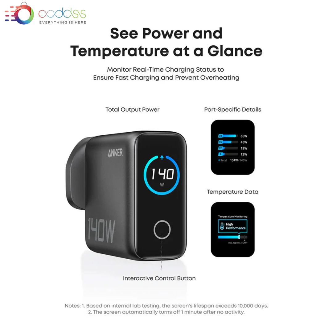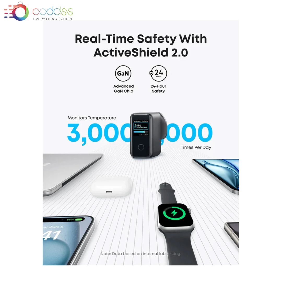 شاحن أنكر 140 واط، 4 منافذ، شاحن GaN قابل للطي PD 3.1 USB-C موديل B2697 يقدم شحنًا سريعًا لأربعة أجهزة في آن واحد بفضل تقنية GaN المتقدمة التي تضمن أفضل أداء. يحتوي على منفذي USB-C عاليي السرعة، يمكن من خلالهما شحن جهاز MacBook Air مقاس 15 بوصة حتى 50٪ في 30 دقيقة فقط، حيث يوفر كل منفذ قدرة قصوى تصل إلى 140 واط. كما يتميز بأمان فائق بفضل نظام ActiveShield™ 2.0 الذي يراقب درجة حرارة الأجهزة أكثر من 3 ملايين مرة يوميًا لضمان حماية مثالية أثناء الشحن. توفر شاشة العرض الملونة عالية الدقة رؤية واضحة ومفصلة لحالة الشحن، ودرجة الحرارة، وتفاصيل المنافذ، مما يبقي المستخدم على اطلاع كامل طوال الوقت.