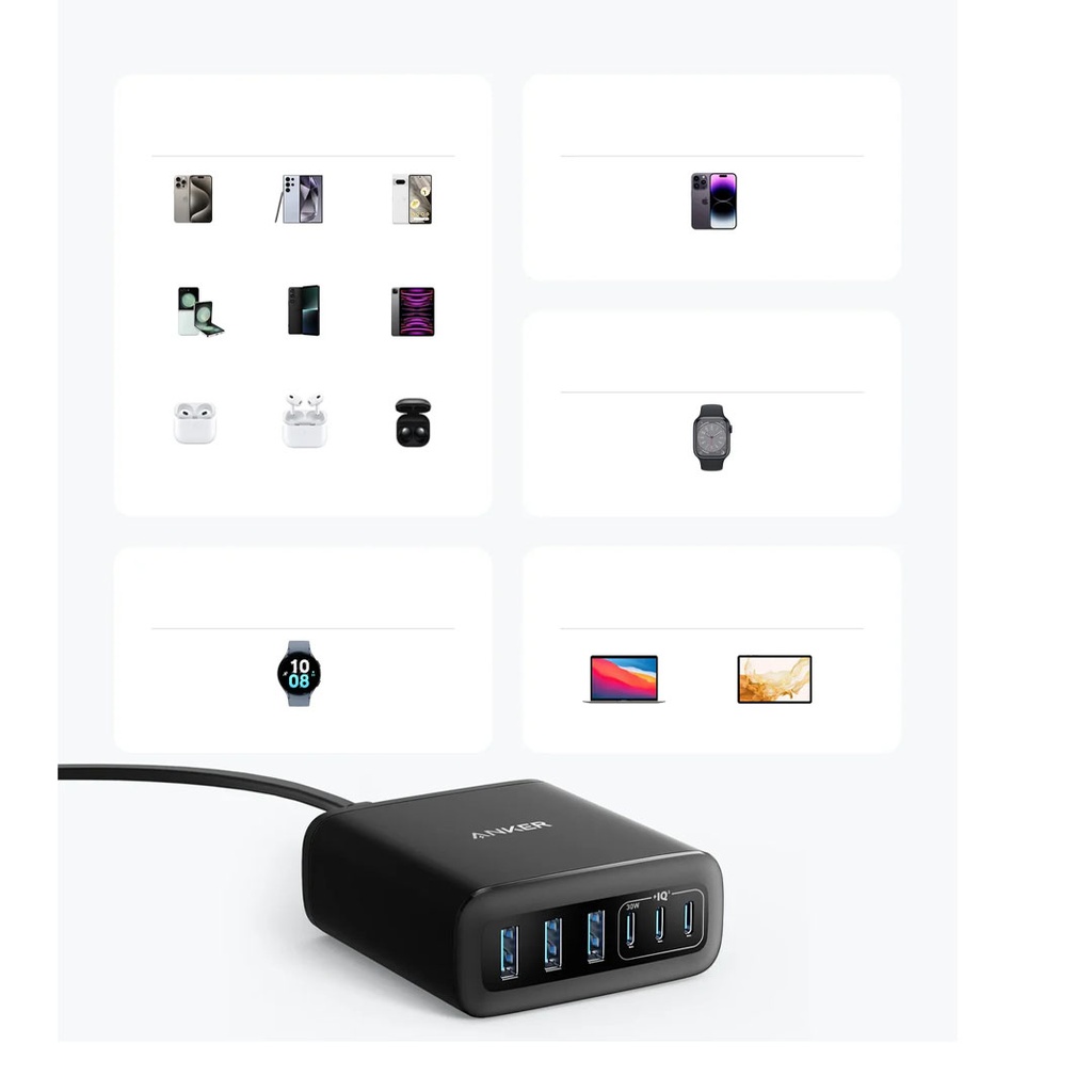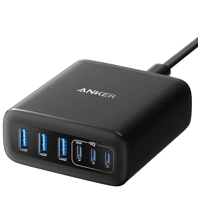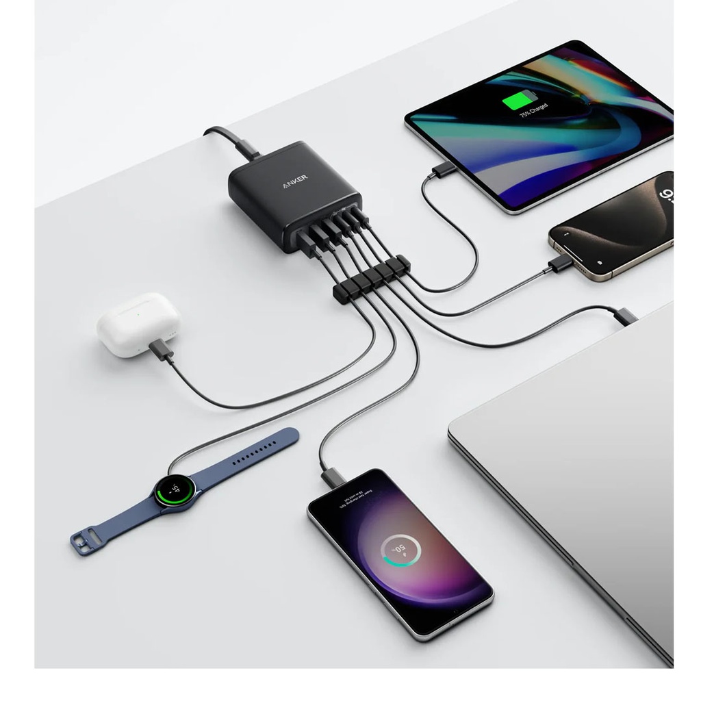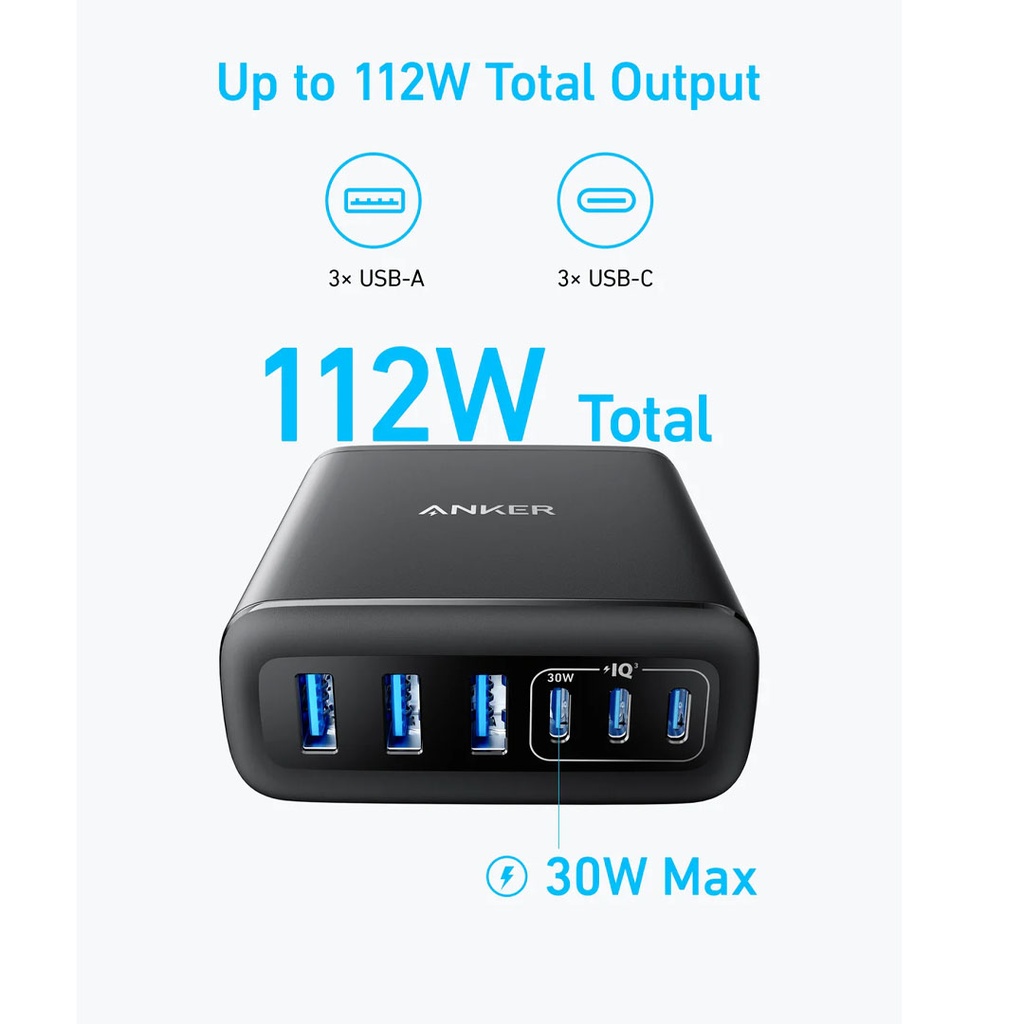 شاحن أنكر (112 واط، 6 منافذ، بتقنية GaN) – أسود
