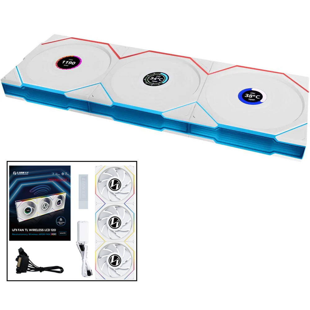 - مروحة Lian Li UNI FAN TL Wireless LCD مقاس 120 مم بشفرات عكسية مع إضاءة ARGB لاسلكية وشاشة LCD – اللون أبيض (مجموعة 3 قطع)