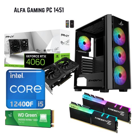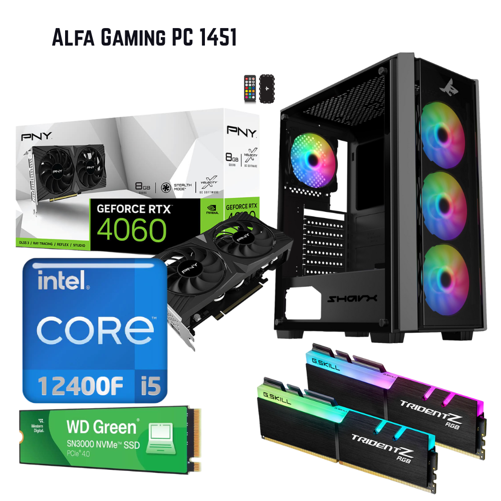 كمبيوتر ألعاب ألفا 1451 معالج Intel Core i5-12400F الجيل الثاني عشر ذاكرة GSKILL Trident Z RGB سعة 16GB DDR4 بتردد 3600MHz قرص WD Green SN3000 سعة 500GB M.2 NVMe SSD بتقنية PCIe Gen4 بطاقة رسومات PNY GeForce RTX 4060 VERTO سعة 8GB بمروحتين (Dual Fan)