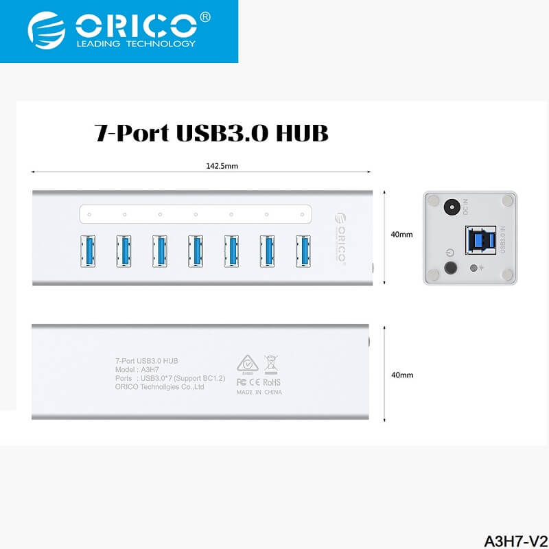 - Orico 7Port Hub USB3.0 Aluminum Alloy A3H7, LED Power Indicator, Silver