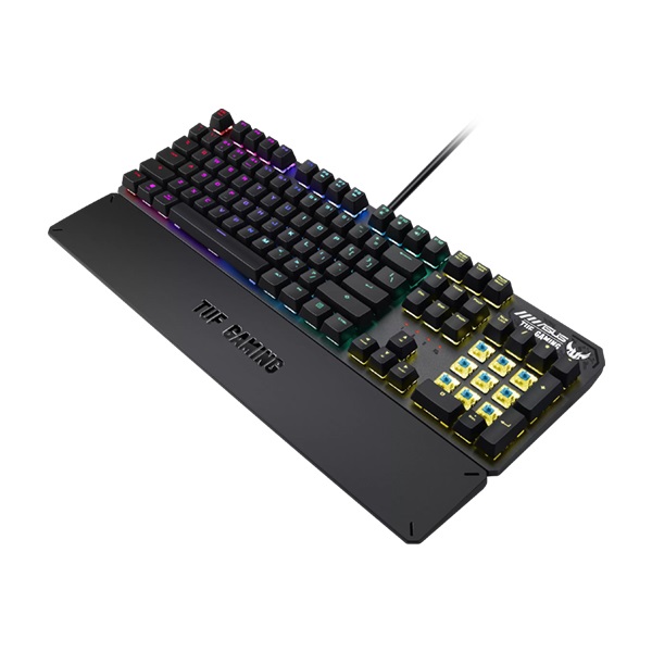 ASUS TUF Gaming K3 RGB mechanical keyboard with N-key rollover, combination media keys, USB 2.0 passthrough, aluminum-alloy top cover, wrist rest, eight programmable macro keys and Aura Sync lighting