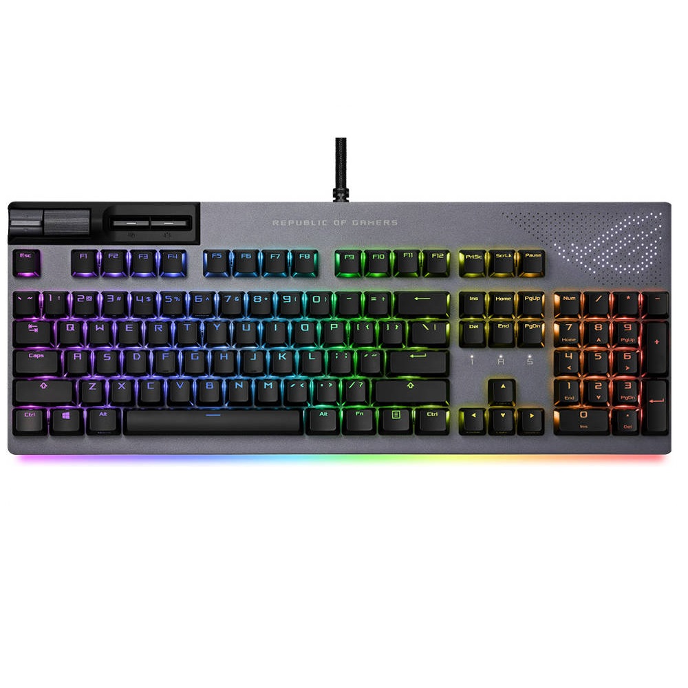 - ROG PBT doubleshot keycaps: Durable keycaps with mid-height profile and shorter stems reduce key wobble and feature translucent ROG script