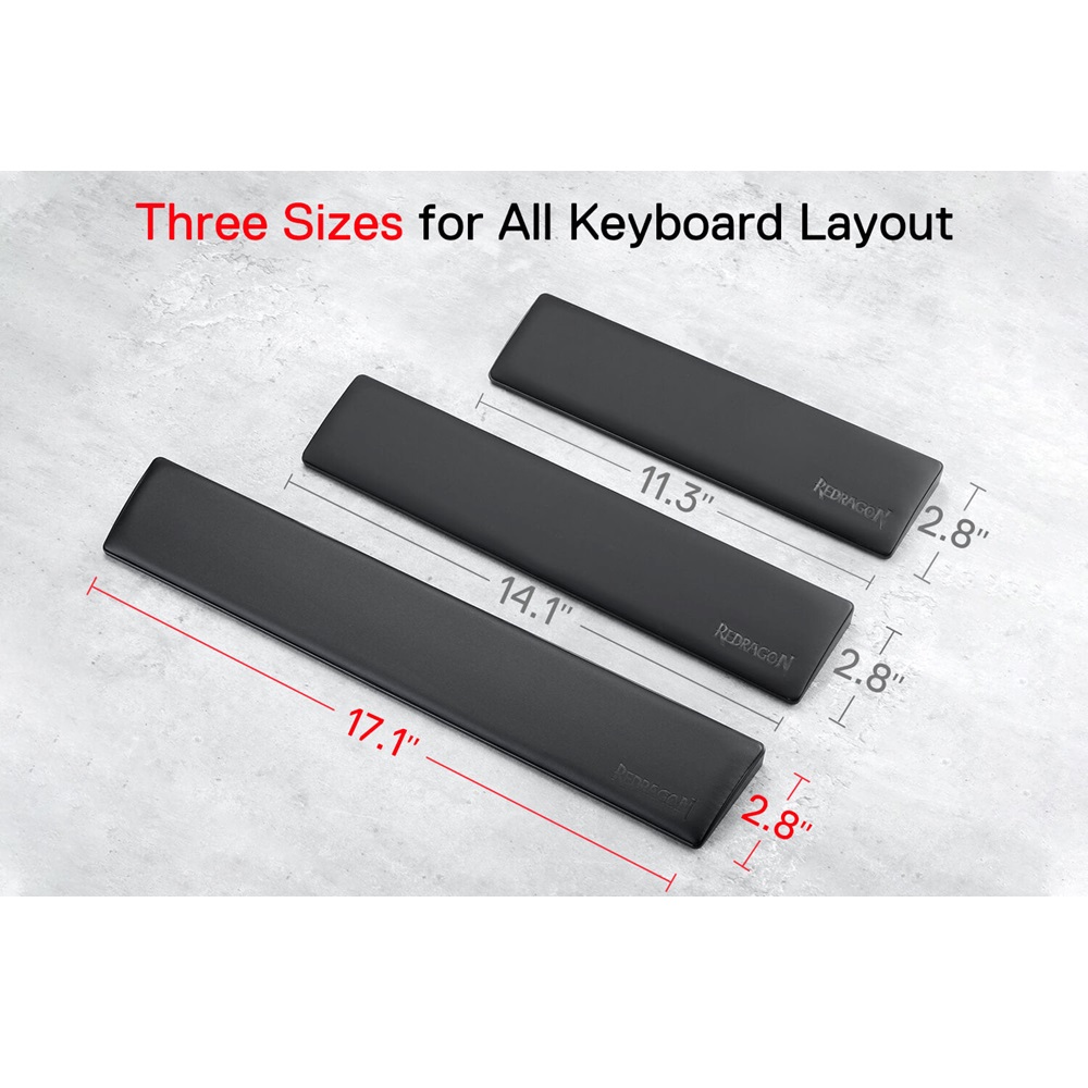 3 different wrist support pad sizes for almost all keyboards in the market, 60% 61 keys, 87 keys tenkeyless and standard 100% 104 keyboard are all suitable.