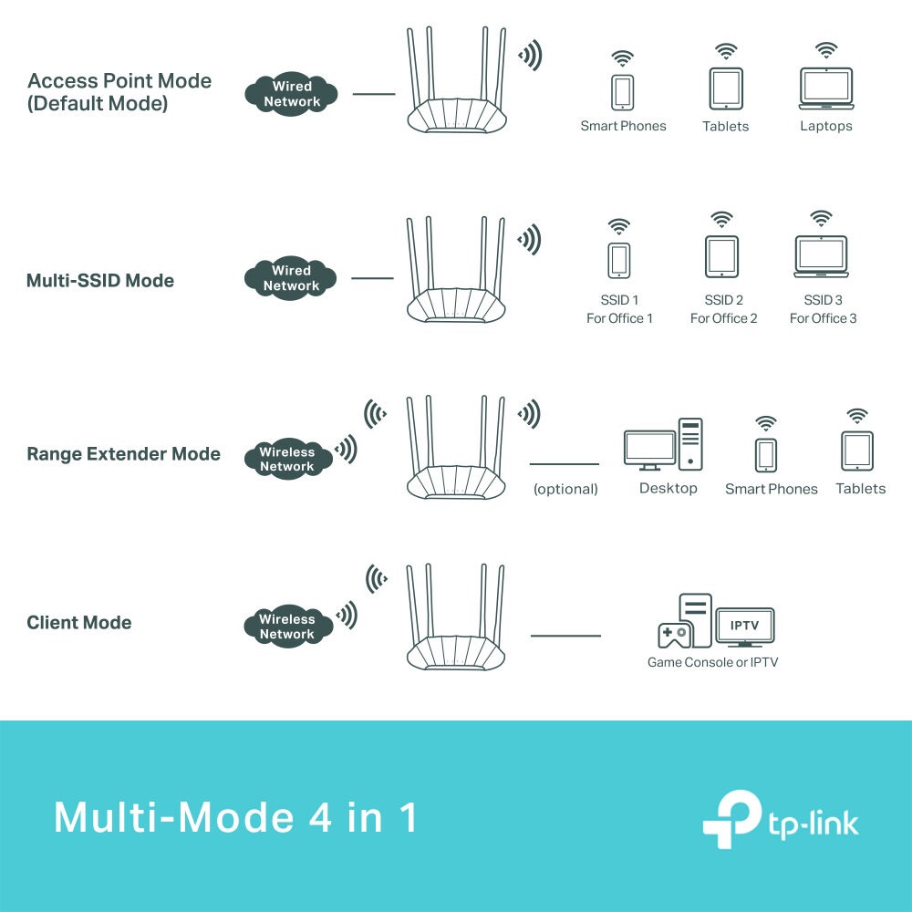 - Multiple Modes – Supports Access Point, Range Extender, Multi-SSID, and Client modes to meet any network needs.