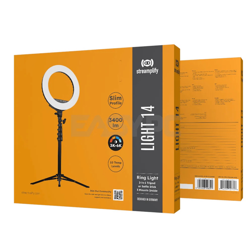 Streamplify Ring Light 36cm/14 inch, outside dim. size Color temperature 3000K-6000K Tripod stretched height 0.5m ~ 1.7m Supports smartphone width up to 76mm Camera cold shoe support / Remote Controller