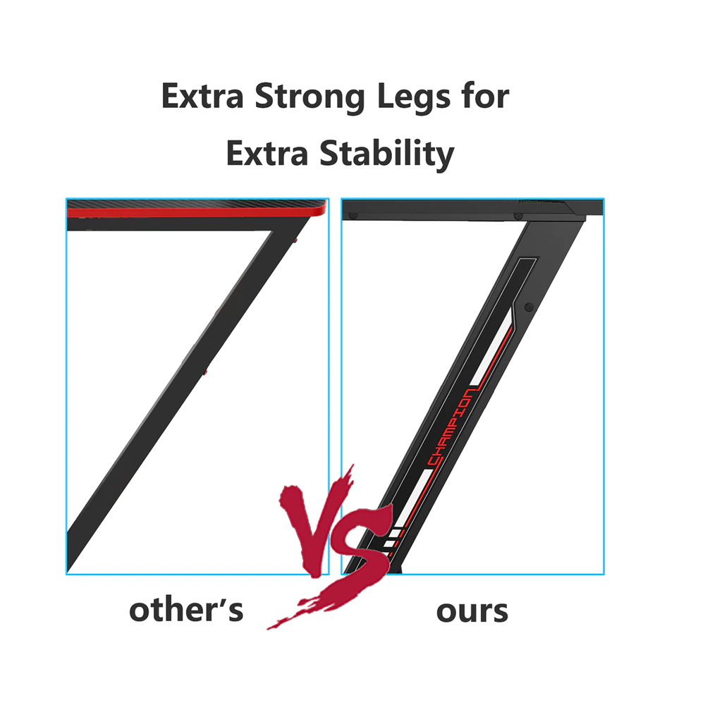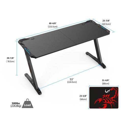 60″ with Extra Large carbon fiber texture Top RGB LED light effects Larger mouse pad (600 x 800mm) Headset hook, Cup Holder, Gamepad holder (Optional) Rock solid Z Shaped Leg Design