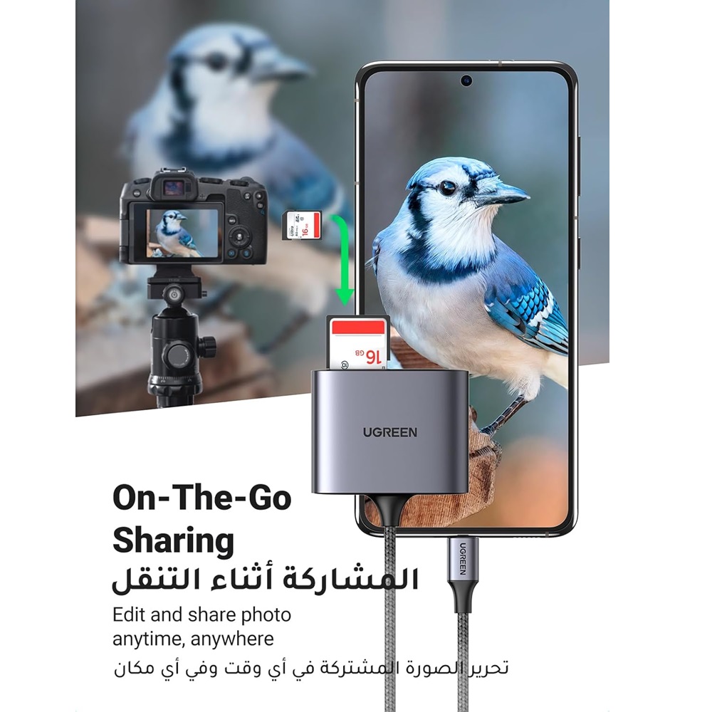 The UGREEN USB C card reader SD TF can simultaneously access data from two memory cards and exchange data directly between the two slots.