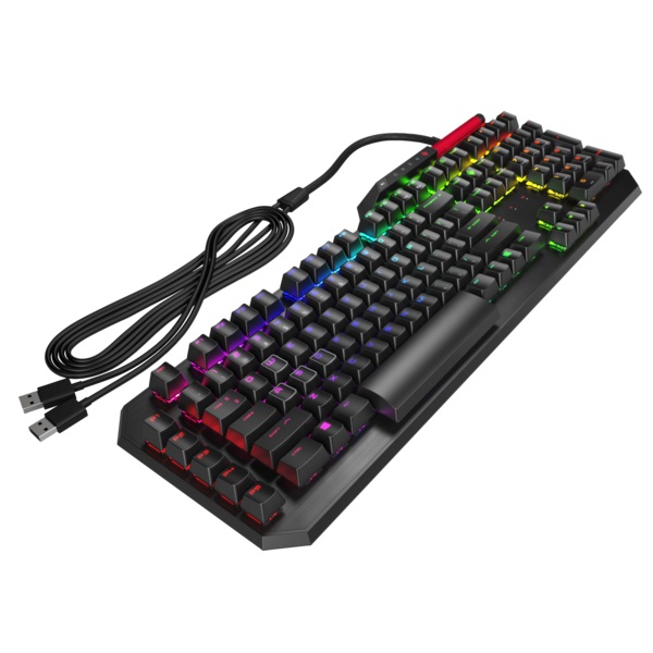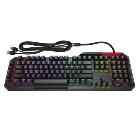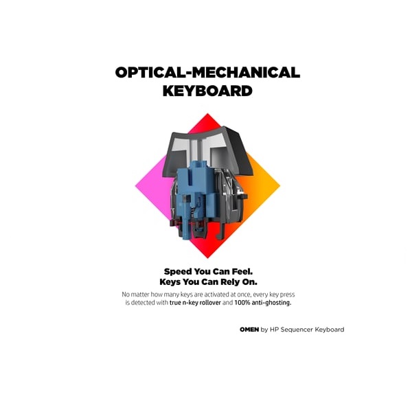 Optical-mechanical Blue switches enable a 0.2ms response time – 10 times faster than traditional mechanical switches – plus a 70 million click lifetime Individually backlit keys offer up to 16.8 million RGB colours to choose from with unique effects, all customisable from the OMEN Command Centre Take control of your media with dedicated keys for play, pause, skip, and mute, as well as an over-sized metal roller bar to adjust volume