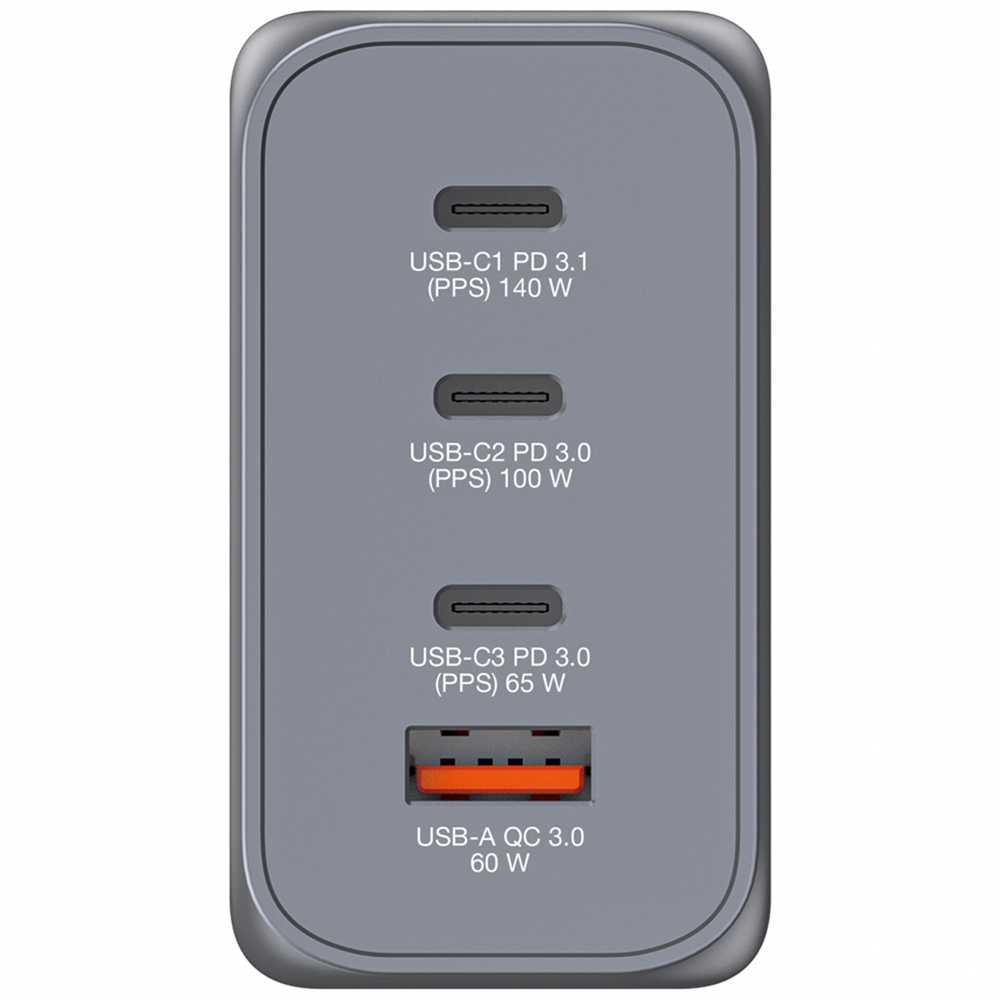 - Equipped with 1 x USB-C® PD 3.1 up to 140W, 1 x USB-C® PD 3.0 up to 100W, 1 x USB-C PD 3.0 up to 65W, and 1 x USB-A QC 3.0 up to 60W