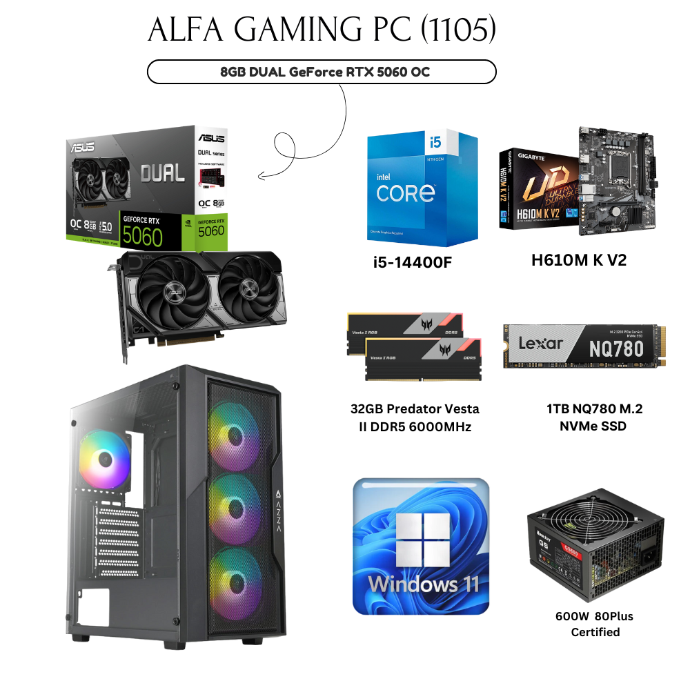 Alfa Gaming PC 1105 Intel Core i5-14400F Processor Lexar 1TB NV2 M.2 NVMe SSD, 6500MB/s AZZA Fighter Mid Tower Gaming PC Case – 4-Fans ASUS 8GB DUAL GeForce RTX 5060 OC Edition VGA Acer 32GB Predator Vesta II DDR5 6000MHz RAM, (16GB x2) USB WiFi 5G / Win11Pro