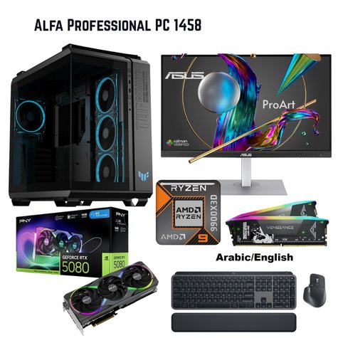 • Alfa Professional PC 1458, AMD Ryzen 9 9900X3D, RTX5080, 32GB, 2TB, ASUS GT502, W11Pro, ASUS ProArt PA279CV, Logitech MX KEYS S Combo