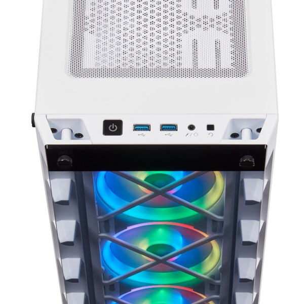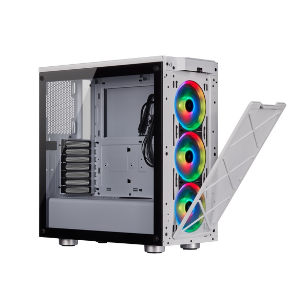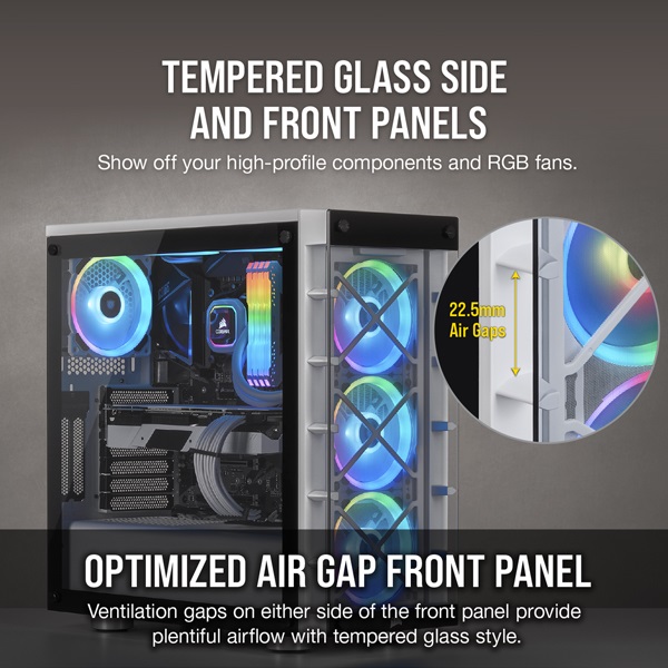 A strong, durable steel chassis and 4mm-thick Tempered glass Side and front panels showcase your components and RGB fans, with ventilation Gaps for plentiful airflow Room to install up to 6x 120mm cooling fans or multiple radiators in sizes up to 360mm Drive trays accommodate up to two 3.5in HDDs and two 2.5in SSDs, with two additional 2.5in mounts Includes three Corsair LL120 RGB cooling fans that deliver powerful airflow Up to 1, 500 RPM, with 16 RGB LEDs per fan and seven mesmerizing preset iCUE lighting profiles Fully control and synchronize your RGB lighting out-of-the-box with the included iCUE lighting Node Core and Corsair iCUE software